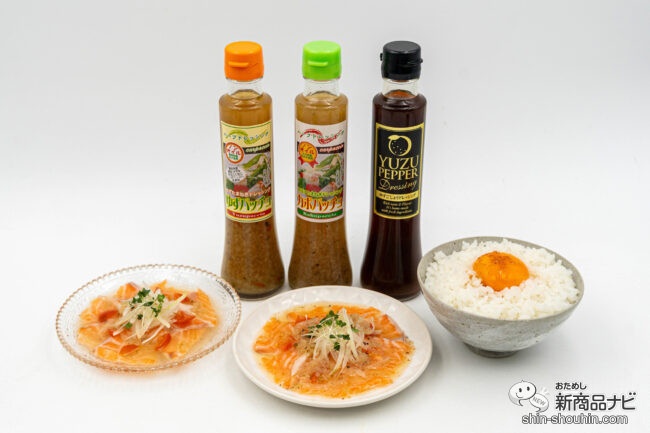 甘さが際立つ『ゆずパッチョドレッシング』、さっぱり仕立ての『カボパッチョドレッシング』、ピリッと辛みが効いた『ゆずごしょうドレッシング』、それぞれの個性を楽しんでほしい。