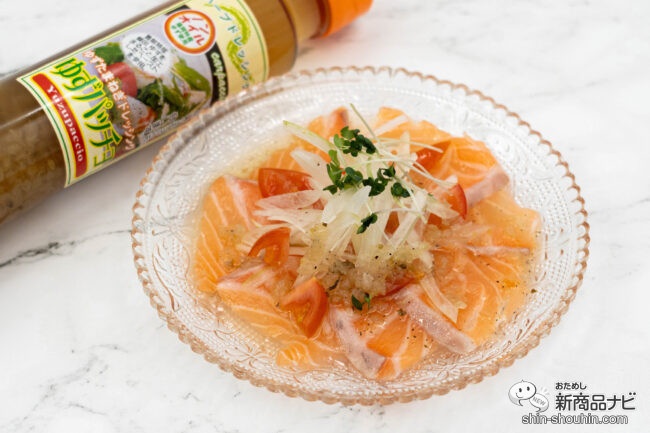 ギュッと搾ったカボスが20%配合されていることで、とろみがあり素材との絡みがよさそうだ。本品もハーブの香りが心地よく、カルパッチョはもちろん焼き魚、お豆腐、お鍋のつけダレとしても活躍してくれるだろう。