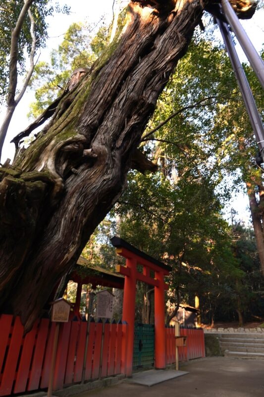 天気が良い日でも薄暗い、森の深緑の中に鎮座する朱色の社殿。そして、ひっそりと置かれた「陰陽石」、威厳あふれるイブキの巨樹。ここには、神社本来のもつ清浄な空気が流れる空間が存在します。