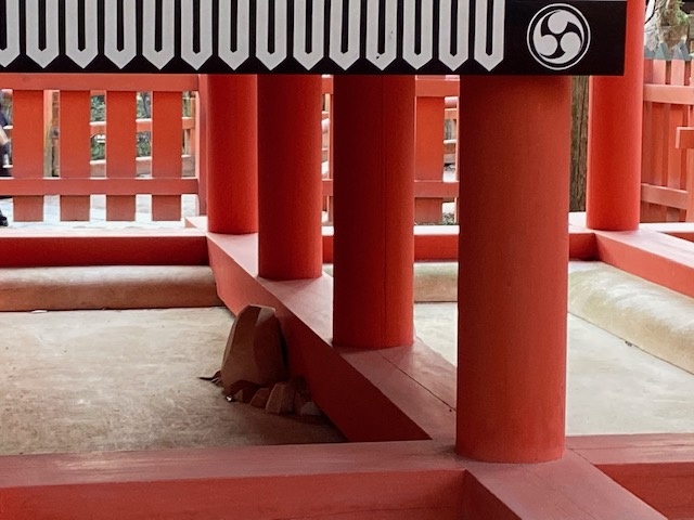 一方陽石は、社殿の土台基礎部分、井桁に組んだ土台の中央部に朱塗りの木材に押しつぶされるようにあり、漆喰で塗り固められています。それ故に原型はよくわかりませんが、磐座の上に男性器の形状の石を置いたのではないかとも推測されます。