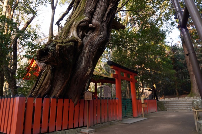 つまり、イブキの幹はすでに空洞になっていて、その中で杉が大きく育ち、その杉はイブキの幹に抱え込まれているということです。この不思議なイブキと杉の共生は、古くから「水谷神社」の「寄生木」として知られています。