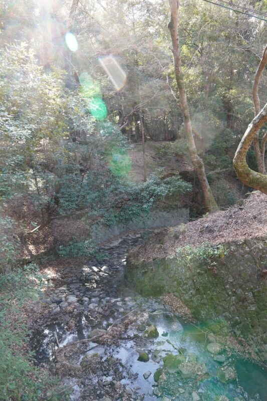 水谷神社の脇を流れる水谷川。夕暮れ前には木々の間から神秘的な日が差し込む(撮影:高野晃彰)