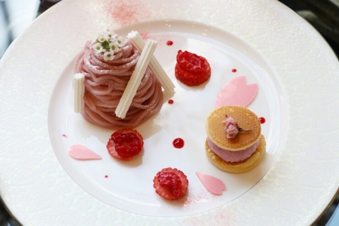 スペシャリテデザートは「桜のモンブラン~洋風 桜餅を添えて~」。桜のモンブランはひんやりとした桜のババロアを桜風味の白あんでデコレーションしたもので、サクサクとした歯触りのメレンゲスティックと添えられたいちごがアクセントになっています。小さな桜餅をパンケーキで挟んだ洋風 桜餅は、ほのかな塩気とモチモチの食感が特徴です。