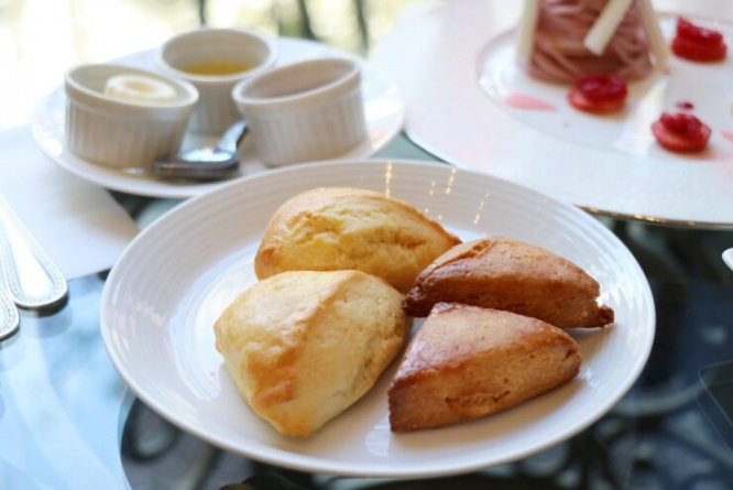 ホテル内のベーカリーで焼き上げるスコーン(ミルクスコーン/桜とホワイトチョコのスコーン)は、焼き立ての香ばしい香りが食欲を刺激します。三角形のスコーンはやや小ぶりでサクッとした歯触りです。