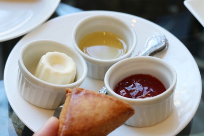 コンディメントは、ゲランドの塩入りのクロテッドクリーム、ストロベリージャム、はちみつの3種類。好きなものをスコーンにつけていただきます。やさしい甘さのスコーンと塩みのあるクロテッドクリームは相性抜群なので、ぜひ試してみてください。