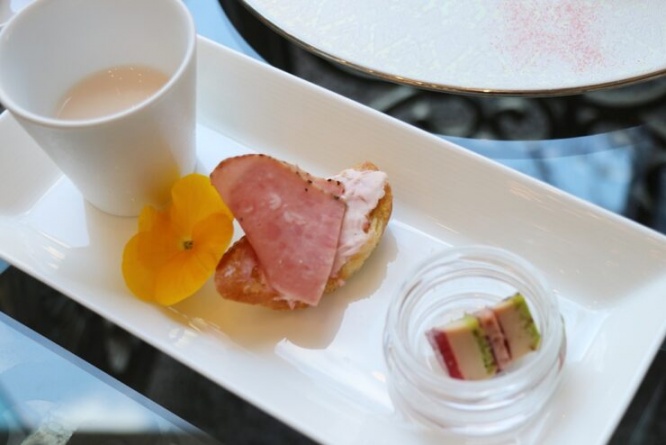 セイボリーは、写真左から順に、蕪のスープ、ポークパストラミのブルスケッタ ベリー風味、フォアグラとピスタチオのミルフィーユの3種類。蕪のスープはほどよい塩気で蕪の甘みが引き立ち、フォアグラとピスタチオのミルフィーユは一口サイズながら複雑な味わいが口中に広がります。