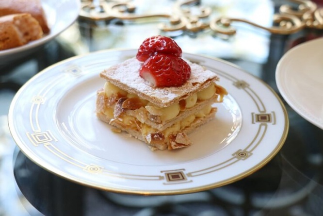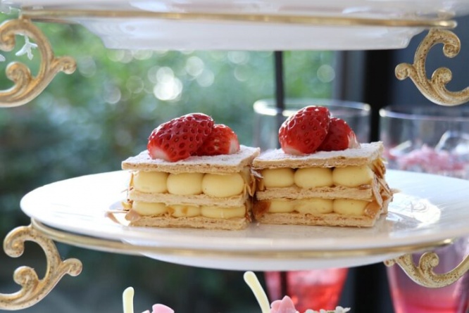 スタンド中段には、ナポレオンパイ。いちごを贅沢に飾ったミルフィーユで、お菓子の皇帝という意味や、ナポレオンのかぶっていた帽子の形に似ていることから「ナポレオンパイ」と名付けられたとか。