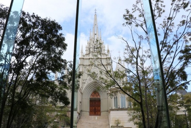 窓の外にストリングスホテル 名古屋のシンボルである大聖堂が見えるロマンティックな空間で、春だけの贅沢なアフタヌーンティーを楽しんでみてください。11:00から21:30まで利用できるので、ライトアップされた大聖堂を眺めながらのナイトアフタヌーンティーもおすすめです。