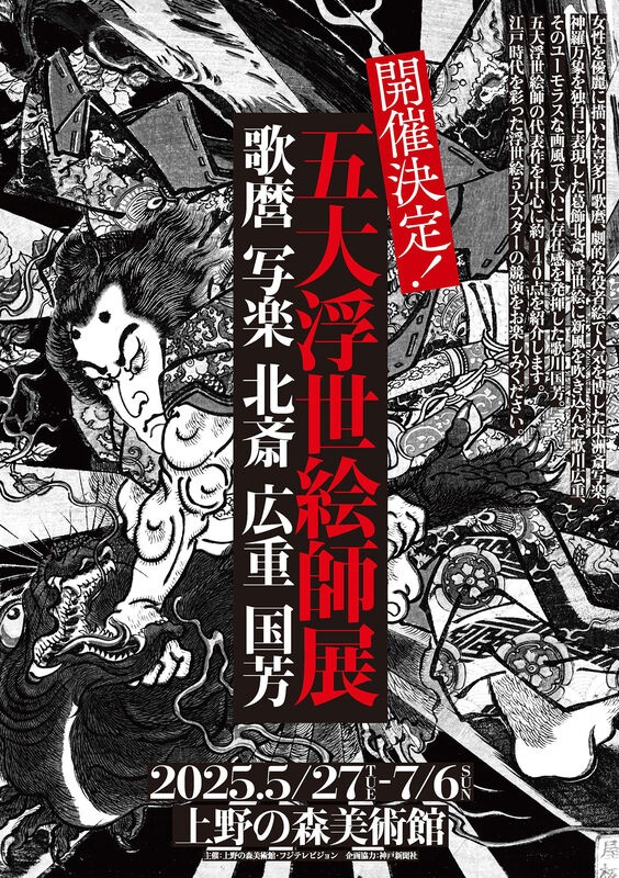 展覧会「五大浮世絵師展 歌麿 写楽 北斎 広重 国芳」は、2025年5月27日 (火) 〜 7月6日 (日)の期間、上野の森美術館で開催されます。