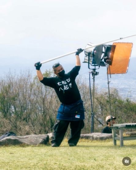 この日の投稿では、「撮影中」と一言コメントし、ドアップのモノクロショットや、「七転び八起き」と書かれたTシャツを着たスタッフの姿など、撮影中の様子を10枚以上に渡って披露した。