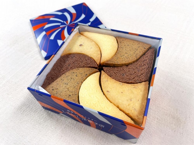 サプライズの連続渦を巻いているようなアーティスティックなデザインが印象的な、「しろいし洋菓子店のクッキー缶」。深みのある青を基調としたトリコロールカラーで、インテリアとしても映えそう......!