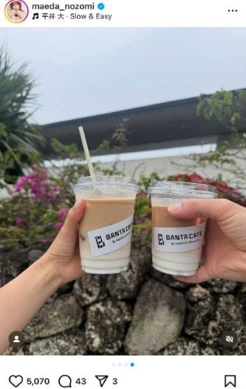 前田はInstagramで「幸せ旅いってきました」と報告し、カフェでリラックスする姿を披露。白のキャミソールを身につけた涼しげな写真とともに「YouTube撮ったけど楽しみすぎてあんまり回せなかったので撮れ高あったらアップします笑」とつづり、4月に結婚を発表したサッカーJ1・浦和レッズ所属の渡邊凌磨選手との仲睦まじい手元ショットも見せた。