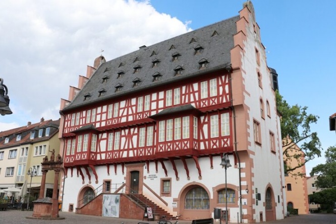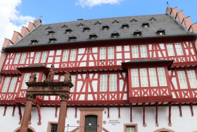 バスターミナルになっているフライハイト広場の北には、立派な木組みの館「ゴルトシュミーデハウス(Goldschmiedehaus)」があります。日本語にすると「金細工師の家」という意味です。