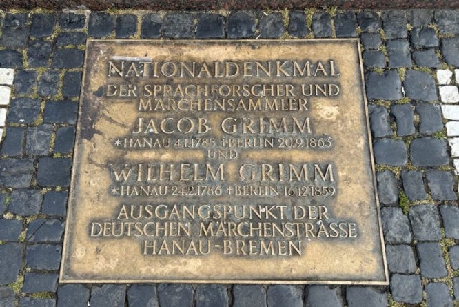 像の足元にはグリム兄弟の名を刻み、ここがメルヘン街道の出発点であることを記したプレートが設置されています。