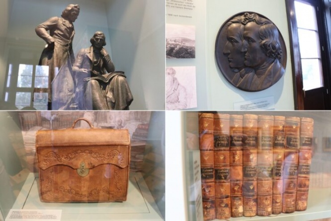 別の部屋にはグリム童話やグリム一家についての展示があり、ヤーコプ・グリムが実際に使用した豚革のかばんや外套などを見ることができます。