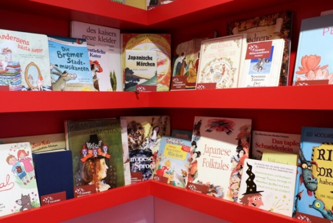 同じフロアには、グリム童話に限らず、世界中の童話や民話の絵本を集めたコーナーもあります。日本のお話もあるので探してみてください。