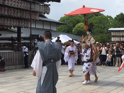 この日から稚児は、正式には地面を踏むことができなくなり、「強力(ごうりき)」と呼ばれる男性が稚児を担いで馬に乗せます。この儀式は俗に「お位もらい」ともいわれ、稚児は八坂神社でお祓いを受け「五位少将十万石」と同じ格式を授かります。これは山鉾巡行(前祭)の際、稚児が長刀鉾の上から貴人を見下ろしても不遜にならないようにとの配慮から。