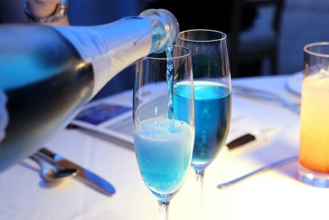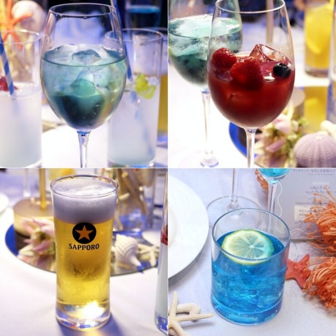 オプションで、「青のスパークリングワイン飲み放題」「アルコール各種飲み放題」「スペシャルドリンク飲み放題」も付けられます。青のスパークリングワインは、フランス産の「ラ・ヴァーグ・ブルー」という、ソーヴィニヨン・ブラン100%の美しい水色のワインです。