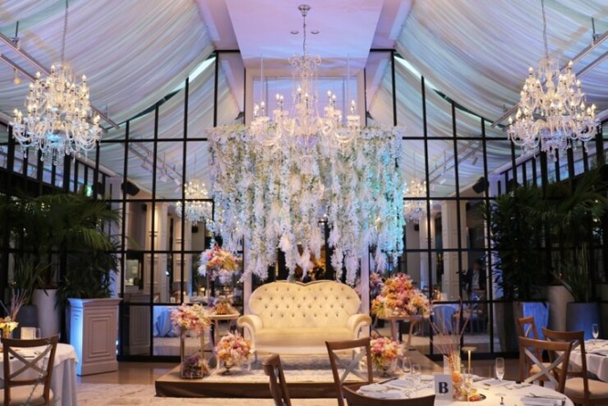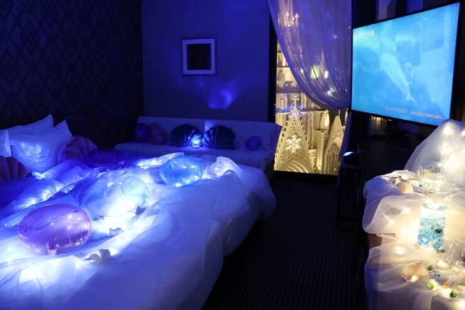 クラゲをイメージしたシャンデリアや波のように揺れる天井の布のひだを眺めていると、海の中にいるような気持ちになるかもしれません。視覚的にも涼しげですし、エアコンが効いた室内空間なので夏の暑さや湿気とも無縁で快適に過ごせます。