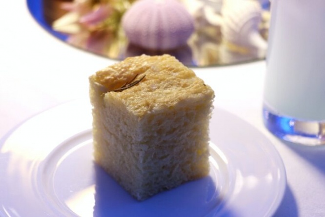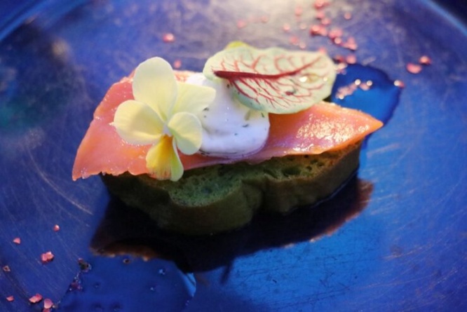 最初に提供される料理は、オニオンサワークリームといっしょにいただくサーモンマリネと萌黄色のケークサレ。甘くない惣菜系のケーキで、萌黄色の生地にはほうれん草が使われています。