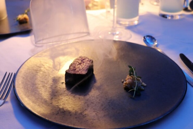 メインのお肉は、牛カイノミのグリリアータ 甘酢生姜のコンディメント 黒胡椒ソース。カイノミはバラ肉の背中に近い希少部位で、赤身のやわらかさと脂身の旨みを兼ね備えているのが特徴です。桜チップのスモークで香り付けをし、目の前で蓋を取ってくれる演出も楽しめます。