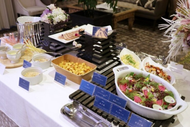 ブッフェスタイルのサラダバーには、色鮮やかな夏の地場野菜や海藻、ポテトサラダ、鰆と芝海老のエスカベッシュ、合鴨炙り焼きなどが並びます。