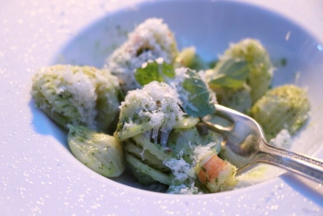 パスタはオレキエッテ 海老と青紫蘇のジェノベーゼ ペコリーノチーズをのせて。オレキエッテは、イタリア語で「小さな耳」という意味を持つ、プーリア州生まれのショートパスタです。