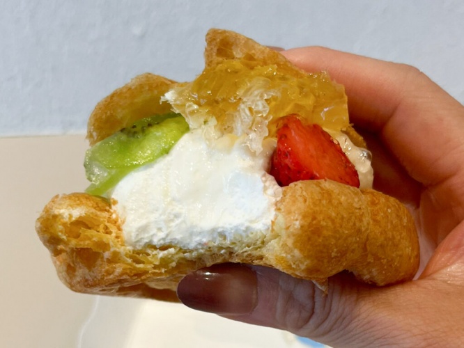 『濃厚コムハニー』は、表参道店の人気No.1メニュー『濃蜜フルーツ』をシュークリームに仕立てたもの。ヨーグルトの上には、大きくカットされたコムハニーが乗っています。
