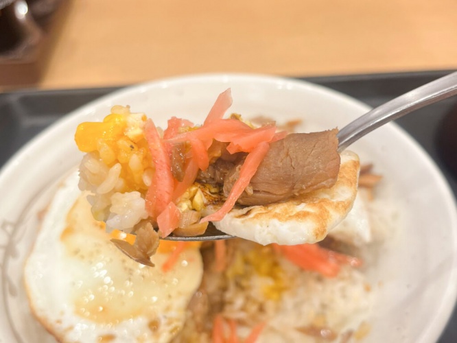 ではさっそくいただきます。程よく塩味が効いた焼き豚、とろっとまろやかな黄身、香ばしく焼かれた白身、そこに甘辛いタレが絡んでたまりません。これはご飯が進んでしまう味!