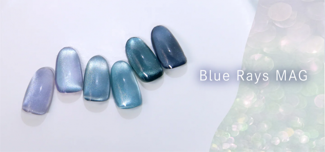 「LUCU GEL Mi」の新色は、「Blue Rays Mag」(ブルーレイズマグ)の名称で、ブルー系のマグネット粒子を含んだ繊細なマグネットジェルである。水や氷を連想させる透明感が特徴的で、自然を感じさせる絶妙なニュアンスカラーが6色もそろっている。