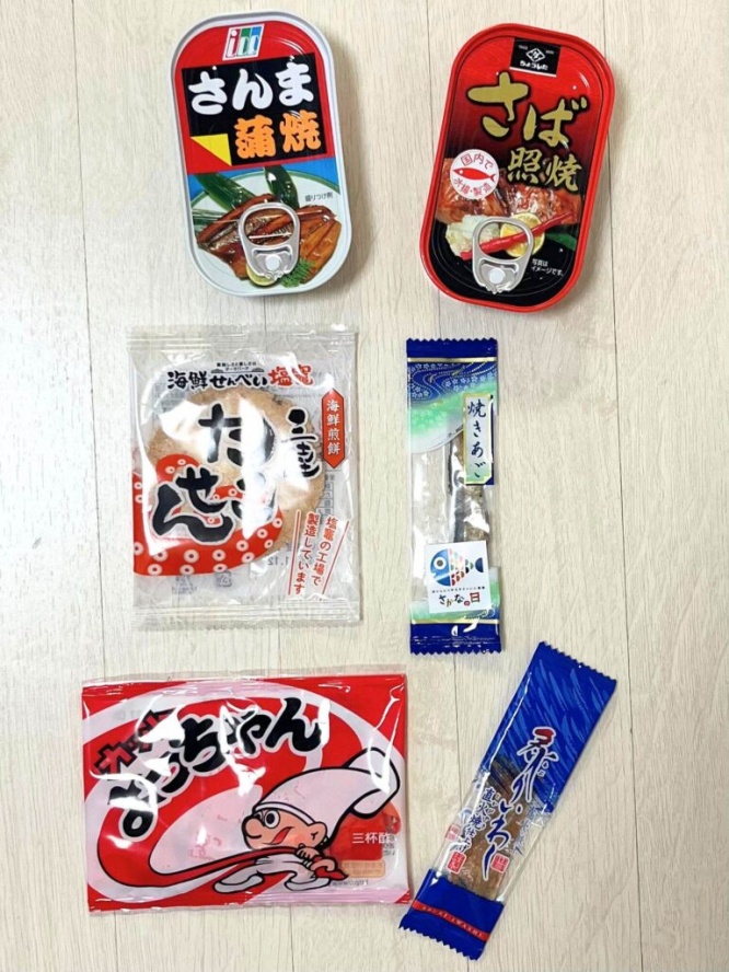 もらったお菓子と缶詰「水産加工品を知ろう!」のプログラムでは、缶詰や鰹節など水産加工品についてさまざまな展示がされていて、クイズに参加するとお菓子がもらえますよ。さらにアンケートに回答すれば缶詰まで!