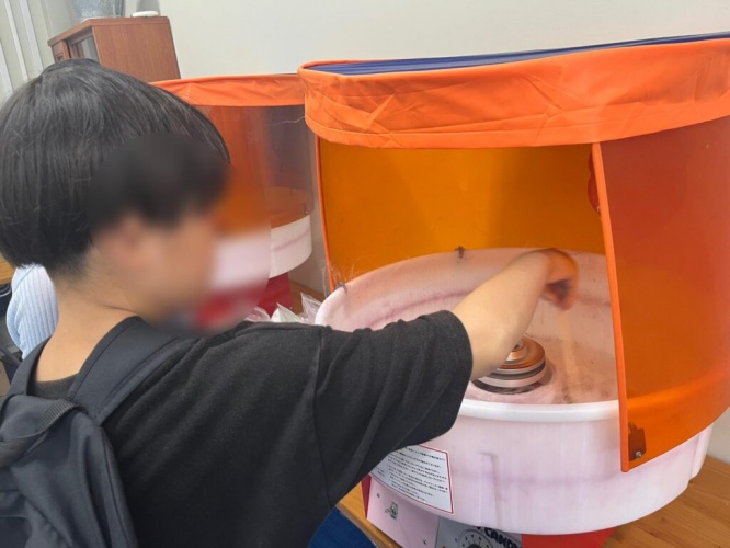 ブースを全部見たら、わたあめ作りのご褒美。お勉強した後の糖分は格別だったようです。