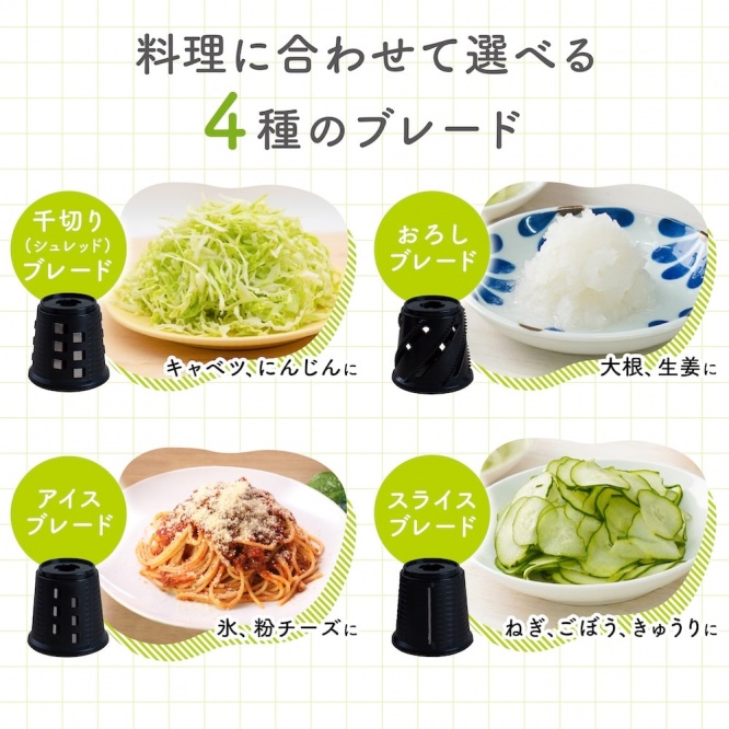 幅18cmのコンパクト設計ながら、氷やかぼちゃも削れるパワフルさが魅力。4種類のブレード(千切り・おろし・アイス・スライス)を付け替えるだけで、ねぎやきゅうりのスライスやチーズ削りも自在にこなせます。特にサンコーオリジナルのおろしブレードは、ふわふわで瑞々しい大根おろしを簡単に作れて食卓でのちょい足しにも便利です。