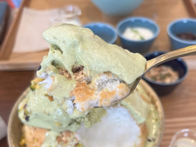 その繊細な氷の粒に、クリームがよく絡みます。食べてみると、ピスタチオときな粉の濃厚なコクがおいしい!優しい甘さが口に広がります。氷はさっと溶けてひんやりした感覚が残り、砕いたピスタチオがいいアクセントになってたまりません。コムハニーは深い芳醇な甘さがピスタチオの風味をより上品に引き立ててくれます。