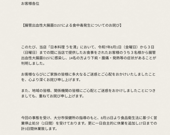 店はホームページで「お客様ならびにご家族の皆様に多大なるご迷惑とご心配をおかけしましたことを、心より深くお詫び申し上げます」などと謝罪した。