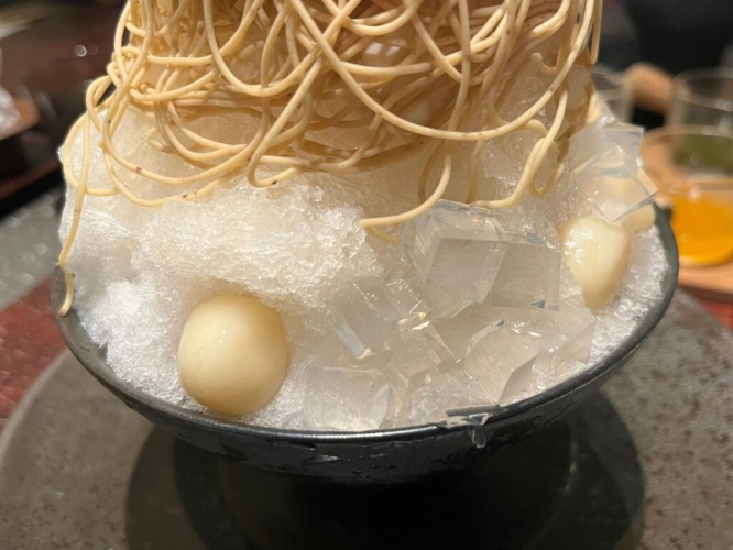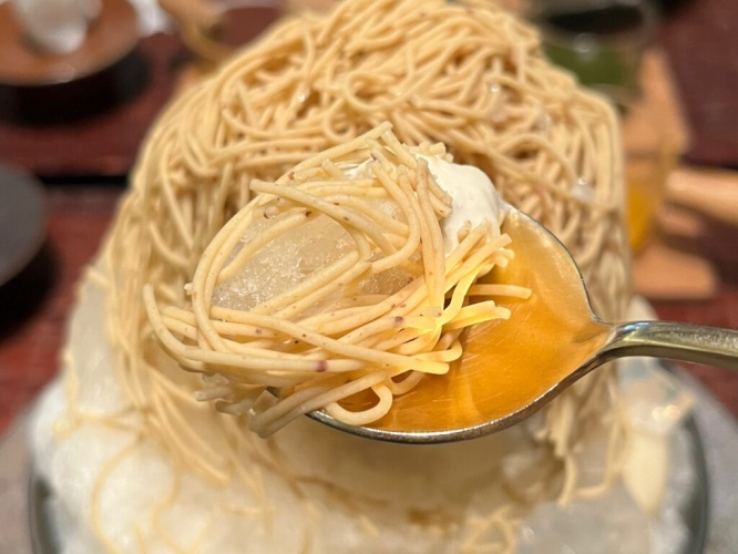 生クリーム不使用のモンブランは、和栗の深い旨みと甘さをダイレクトに味わうことができます。ふわふわの氷と合うことで、なめらかになり優しく口の中で溶けていきました。その口当たりの良さがとても上品で、後に残る和栗の優雅な風味に驚かされます。