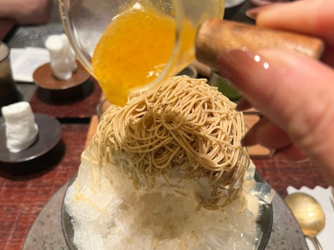 注文して10分ほどで届いたのが『綿雪 -watayuki-』(税込2,280円)。モンブランのかき氷に、静岡茶のソース、練乳ソース、熱海産橙のソースが付いてきます。