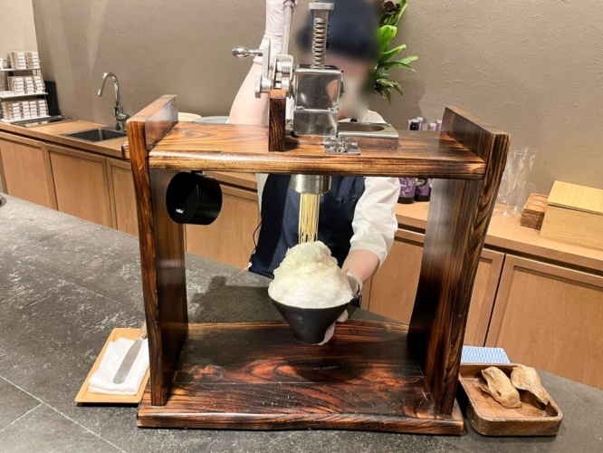 待っていると、自分が注文したものを仕上げる際、声をかけてもらえます。こちらがモンブランを作る機械。幅1mmという繊細なモンブランが、かき氷の上にかけられていきます。