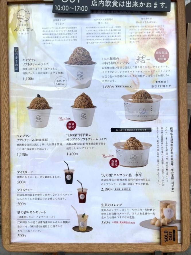 中でも行列ができるお店として知られているのが「和栗菓子kiito -生糸-」。京都の人気店である「和栗専門 紗織」 と熱海一の老舗である「古屋旅館」が共同でプロデュースしたお店です。選りすぐりの熊本県上益城郡産である和栗を使ったモンブランが有名ですが、夏場はそのモンブランをトッピングしたかき氷を食べることができます。