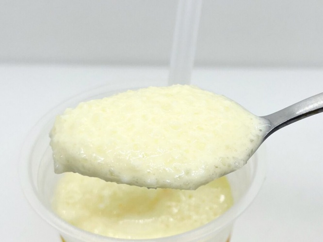 淡い黄色のフラッペからは南国を彷彿とさせる爽やかな香りがします。フラッペの中には、氷の粒が見えますね。