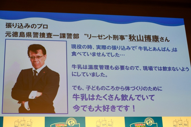 そして、実際に「牛乳&あんぱん」という組み合わせが、張り込みに最適なのかをその道のプロに確認することに。張り込みのプロとして、元徳島県警捜査一課警部、通称“リーゼント刑事”の秋山博康さんのコメントが会場のモニターに映し出された。秋山は「現役のとき、実際の張り込みで『牛乳とあんぱん』は食べていませんでした……。牛乳は温度管理も必要なので、現場では飲まないようにしていました」と、実体験をもとに語った。