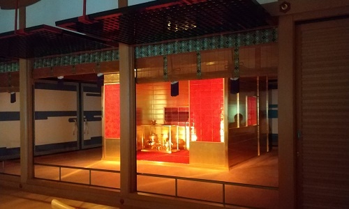 秀吉が黄金の茶室を披露したのは天正14年(1586年)1月、年初の参内において御所へ運び込み、正親町天皇(おおぎまちてんのう。第106代)の天覧に供されました。