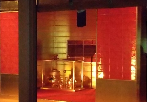 このほか畳表は朱紅色の猩々皮(しょうじょうひ)、茶道具も茶筅(ちゃせん)と茶巾(ちゃきん)を除いてすべて金箔を張った徹底ぶりです。