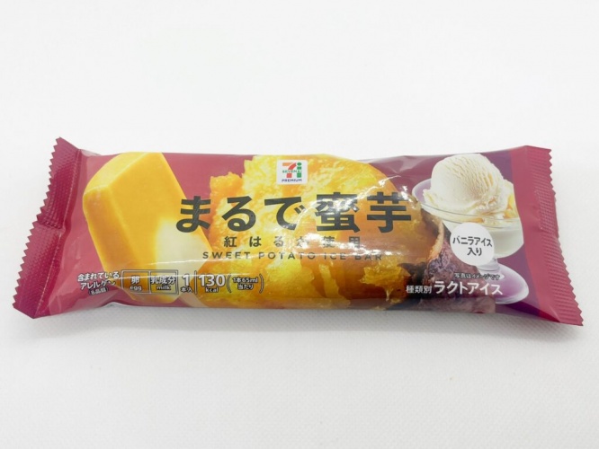 続いては、9月30日(火)から販売されているセブン-イレブンの「セブンプレミアム まるで蜜芋」。セブンプレミアムの“まるで〇〇”シリーズは、本当に素材そのものを食べているかのような味わいで人気のアイスです。取り出してみると、濃厚な蜜芋の色がとてもおいしそう!