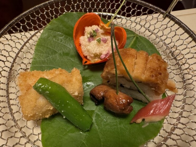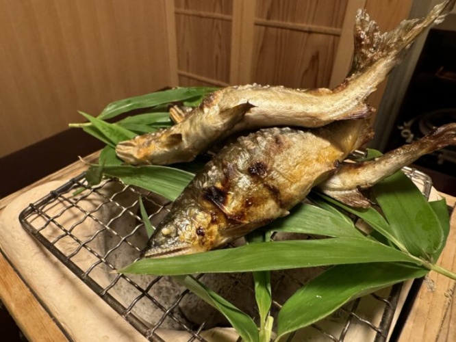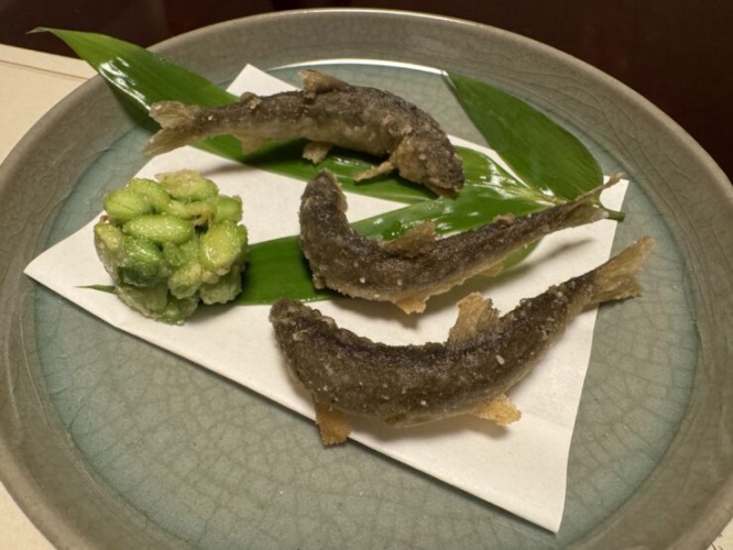 鮎の天ぷらも非常に美味で、美しく供されます。