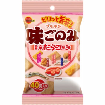 ピリッと辛味の効いたたらこ風味の米菓や豆菓子など5種類の生地を1袋に詰め込んだ“味ごのみ”。たらこの風味と辛味が食欲をそそるとともに、ごまいりこの甘辛い味わいがアクセントになった止まらないおいしさ。