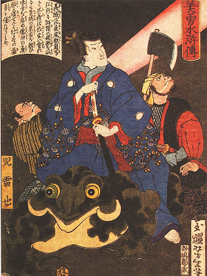 鬼武が生み出した自来也は大きな反響を呼び、天保10年(1839年)から明治元年(1868年)まで美図垣笑顔(みずがき えがお)が『児雷也豪傑譚(じらいやごうけつたん)』を連載しました(残念ながら未完)。