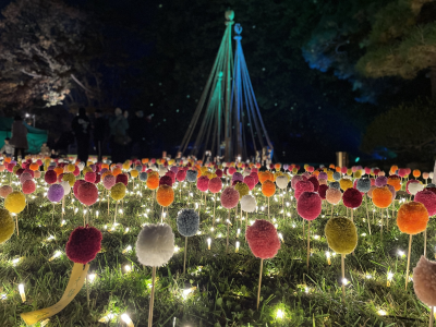 丸い菊の花ピンポンマムをモチーフにした毛糸でできた「ぽんぽんマム」が三の丸庭園を敷き詰めます。<りんごの花手水(はなちょうず)>