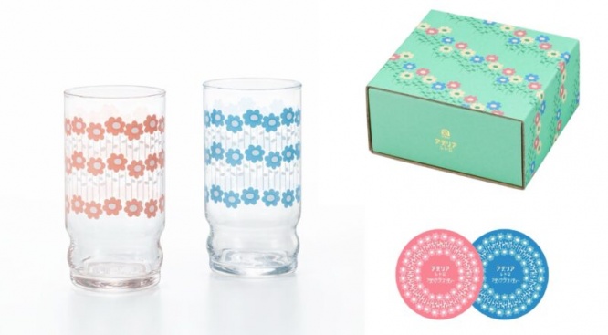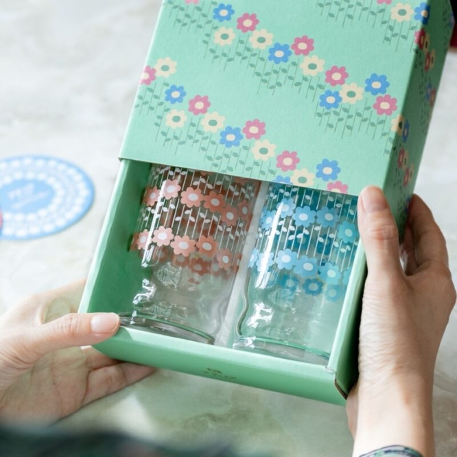 普段使いしやすく安定感のある「アデリアアレンジ」のグラスに、ピンクとブルーの花柄をあしらい、さらに、おそろいの紙製コースターを添え、色鮮やかな化粧箱へ詰め込んだペアセットとして仕上げています。