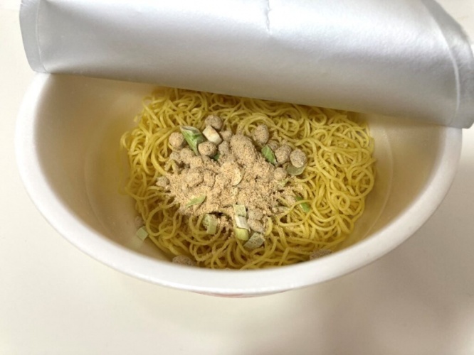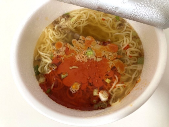 かやく入り粉末スープだけを中に入れると、すでに花椒の華やかな香りが。お湯を注ぎ5分待っている間は、表記の通りに液体スープと特製ペーストをフタの上で温めます。
